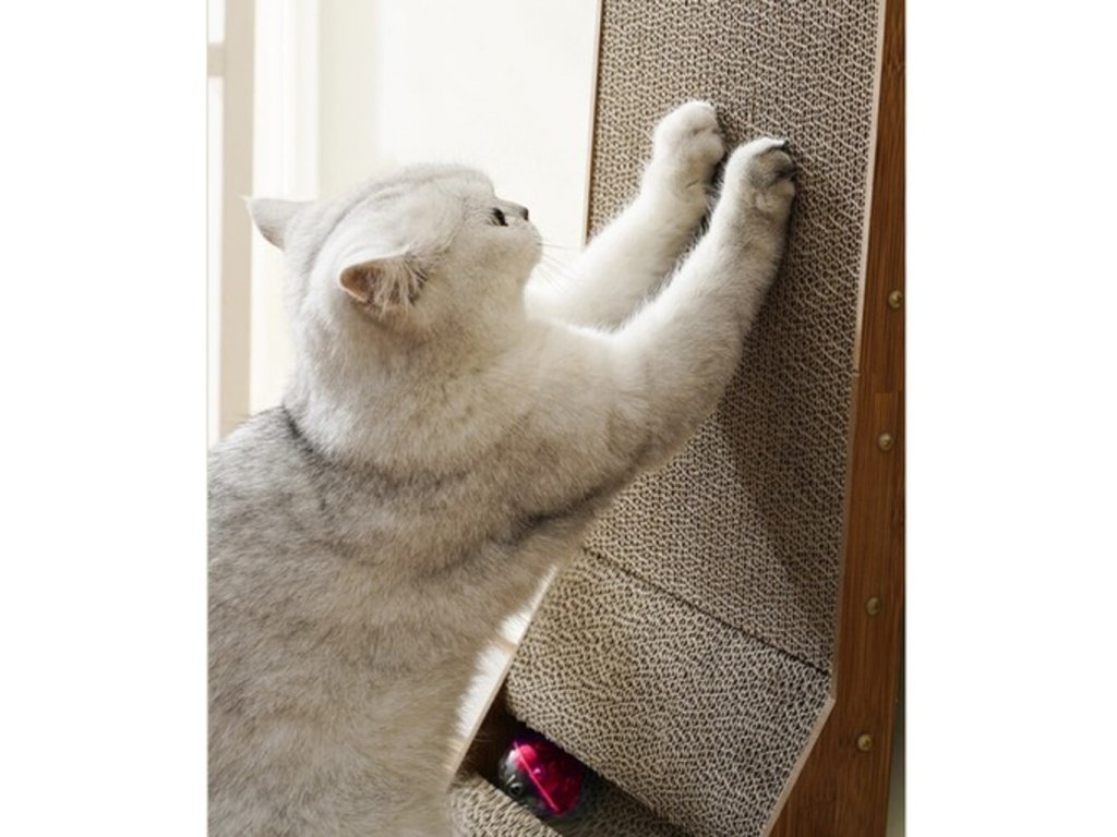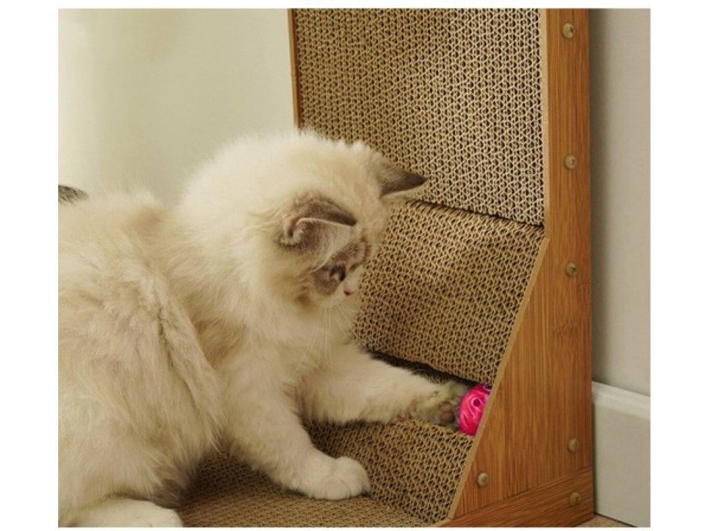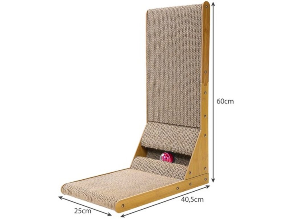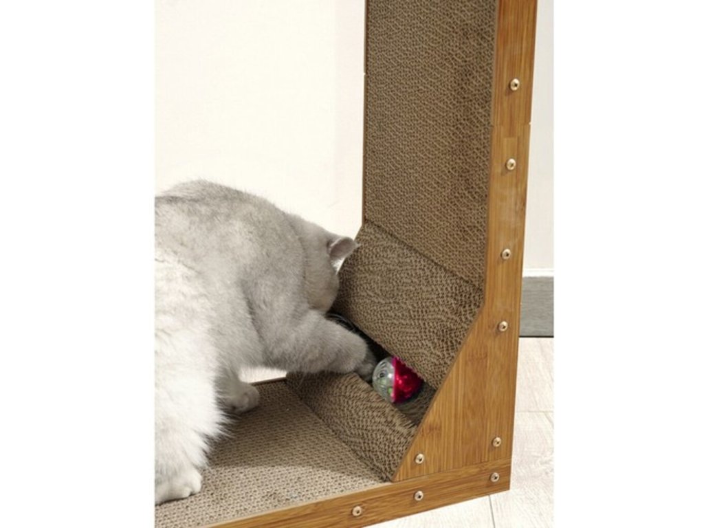 Škrabací podložka je vyrobena ze svislého a vodorovného škrabadla, které jí dodává rohový tvar. Kotě na něm může ležet, škrábat a hrát si. Škrabadlo je opatřeno tunelem s míčkem na hraní. Toto vysoce kvalitní škrabadlo pro kočky poskytne vašemu mazlíčkovi dlouhé chvíle relaxace a zároveň uspokojí každodenní potřeby škrábání a broušení drápků. Škrabadlo pro kočky je vyrobeno z kartonu a po stranách potaženo MDF rámem pro pevnost. Takové škrabadlo je perfektním důvodem k tomu, abyste pohovku nebo dveře v bytě nechali na pokoji. Na odolné škrabadlo bylo přidáno stimulační a relaxační škrabadlo, které zvíře navíc přitahuje a zároveň ho povzbuzuje k používání škrabadla. V tunelu je instalována kulička, kterou se po ní kotě může válet.