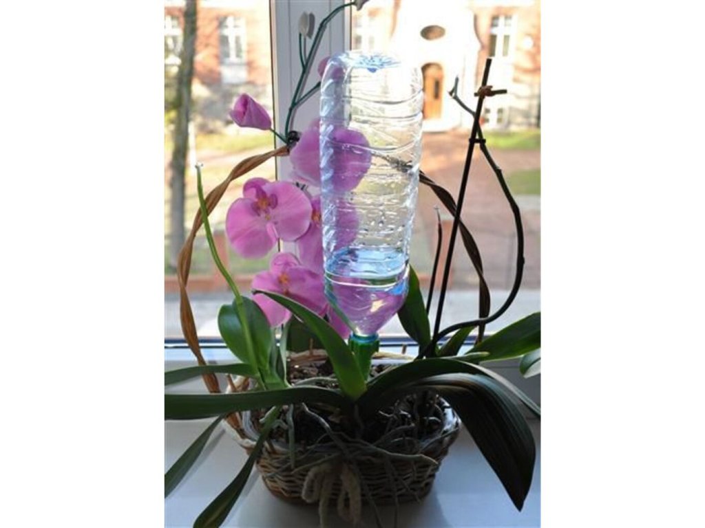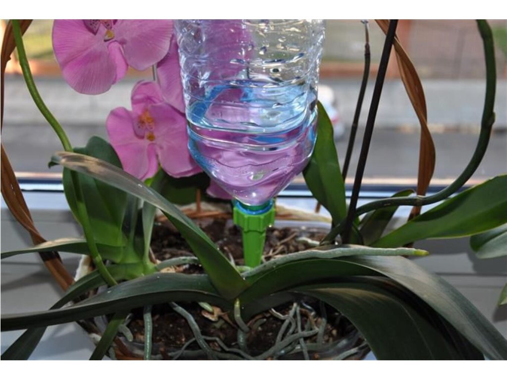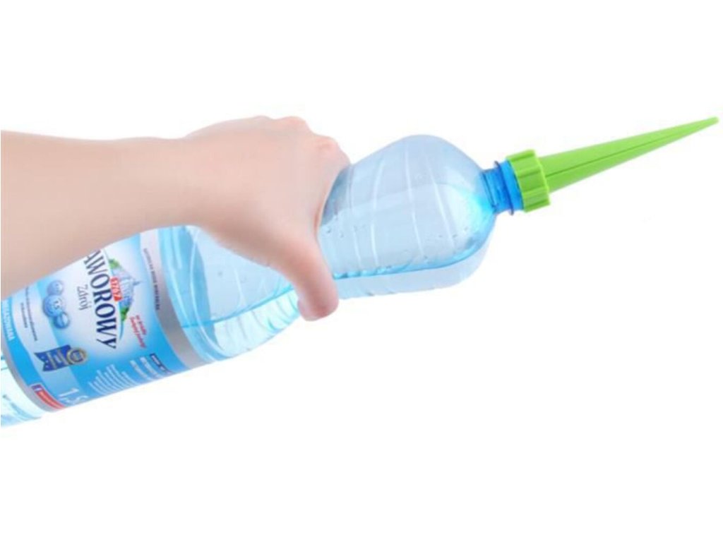 - Po naplnění prázdné láhve čistou vodou zašroubujte irigátor k závitu a zatlačte do země v hrnci