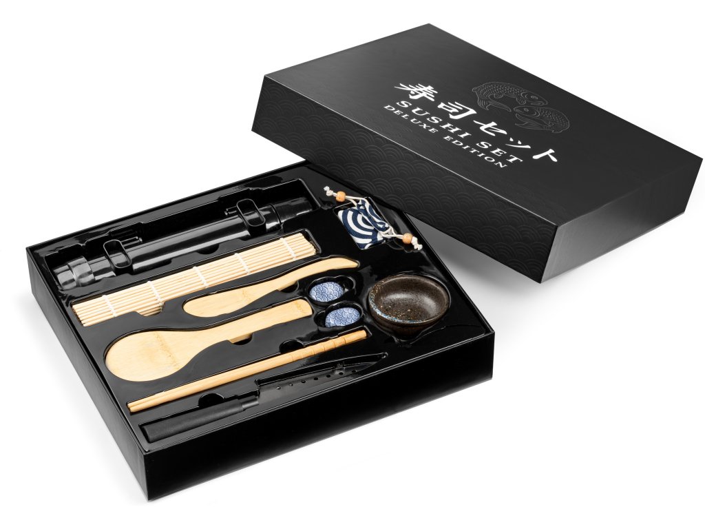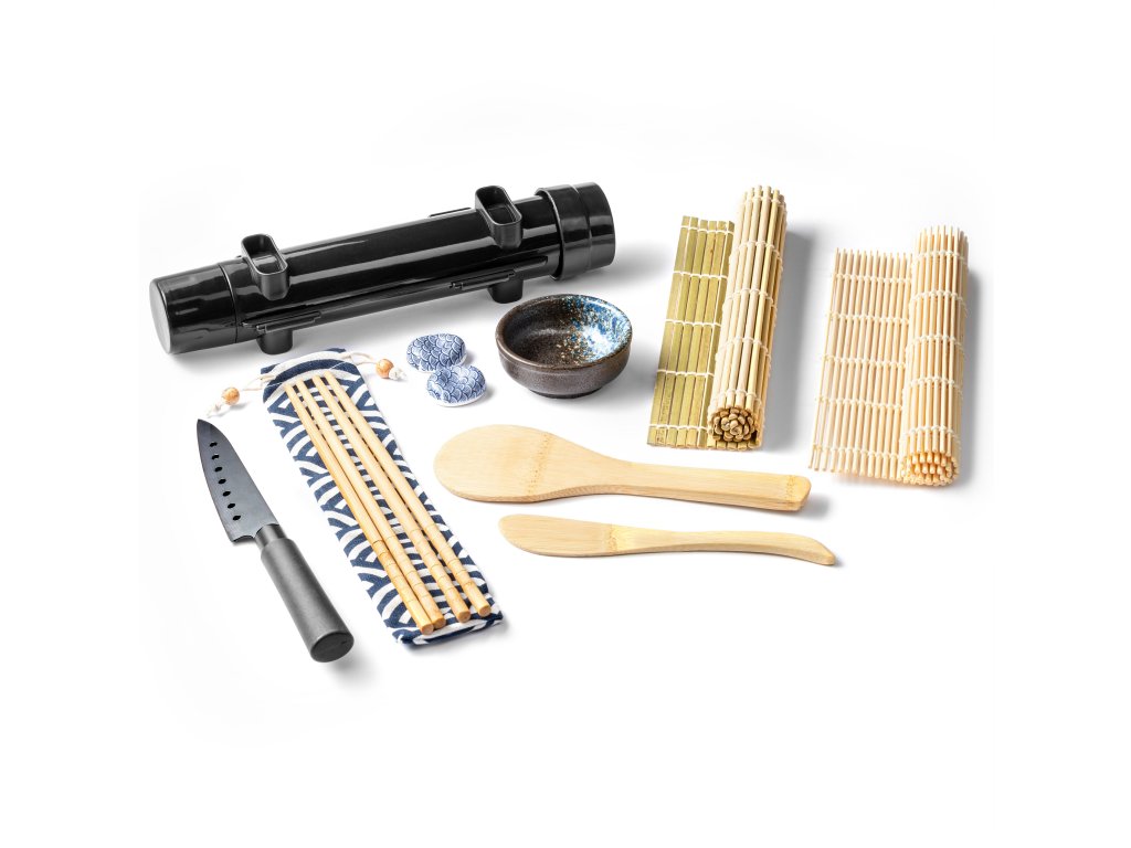 - Sada obsahuje: dvě bambusové podložky na rolování rolek, tubus (váleček) na rýži, nůž na krájení sushi rolek nebo ryb, bambusovou lžíci na servírování rýže, bambusovou špachtli na roztírání rýže, dva páry bambusových hůlek, dva keramické stojánky na hůlky, keramickou misku na sójovou omáčku nebo zázvor, stylový textilní obal na hůlky.